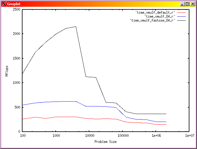 The main points discussed in this guide are illustrated in Fig 2 which presents the computation speed for a dot product operation on two arrays against their size. The three runs correspond to executables compiled with different set of optimisation flags, of which one includes vectorisation. Notice the speed doubling in single precision with respect to the double precision case at around array size 1000 for the executable compiled with vectorisation flag. This is due to the fact that twice as many operands are packed in the vector registers if single precision data are used. The cache effect are visible as steps in performance as the size of the data array increases. Using single precision data allows for larger arrays to be processed faster than compared with their double precision counterpart.
